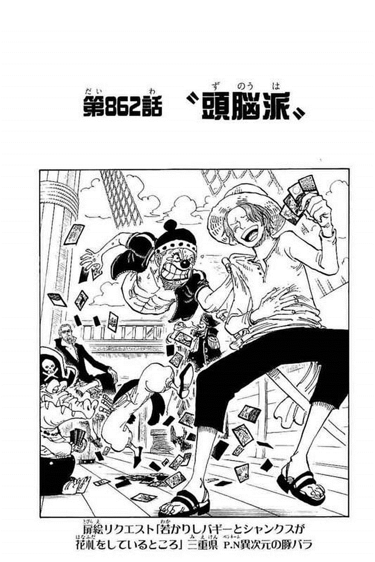 Chapter 862 is titled "The Intelligent Ones" Cover Page Request Buggy and Shanks playing Hanafuda in their youth Mie Prefecture PN Pork Belly from a different dimension In Capone Bege's body, Jinbe attempts to wake up Luffy right before the wedding ceremony starts During the wedding ceremony, Charlotte Pudding prepares to shock Sanji with her third eye inEpisode 2 The Land of Wano!Sulong Carrot Vs Daifuku & Big Mom Pirates (One Piece Episode 862) Sulong Carrot fights Daifuku and the Big mom pirates in the latest episode of One Piece